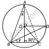 निम्नलिखित आकृति में, O वृत्त का केंद्र है और ∠BCO = 30° है। x और y ज्ञात कीजिए।