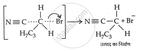 \[\ce{K^+CN^- + \underset{{n-ब्यूटिल ब्रोमाइड}}{CH3CH2CH2\overset{δ+}{C}H2 - \overset{δ-}{B}r} -> \underset{{n-ब्यूटिल सायनाइड}}{CH3CH2CH2CH2CN} + KBr}\]