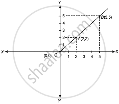 बिंदुओं O(0, 0), A(2, 2) और B(5, 5) को ग्राफ पेपर पर आलेखित करके इन बिंदुओं को मिलाने पर हमें एक सरल रेखा प्राप्त होती है। अतः, दिए गए बिंदु संरेखी हैं।