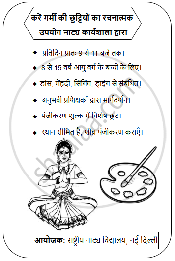 गर्मी की छुटिटयों में राष्ट्रीय नाट्य विद्यालय द्वारा बच्चों के लिए कार्यशाला का आयोजन किया जा रहा है। अतः उसके लिए विज्ञापन तैयार कीजिए।
