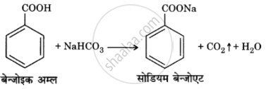 बेन्ज़ोइक अम्ल सोडियम बाइकार्बोनेट के साथ अभिक्रिया पर तीव्र बुदबुदाहट के साथ CO2 गैस मुक्त करता है, जबकि एथिलबेन्ज़ोएट ऐसा नहीं करता।