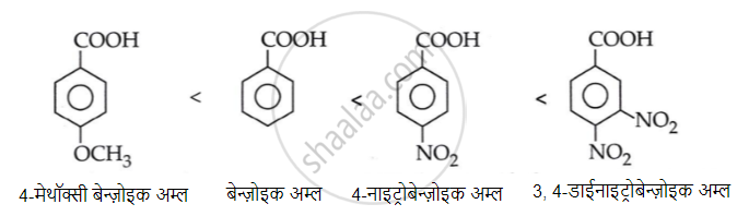 बेन्ज़ोइक अम्ल, 4-नाइट्रोबेन्ज़ोइक अम्ल, 3, 4-डाईनाइट्रोबेन्ज़ोइक अम्ल, 4-मेथॉक्सी बेन्ज़ोइक अम्ल (अम्लता की सामर्थ्य के क्रम में)