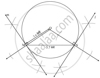 O केंद्र व 3.4 त्रिज्येचे वर्तुळ काढा. वर्तुळामध्ये 5.7 सेमी लांबीची जीवा MN काढा. वर्तुळाला बिंदू M व बिंदू N मधून स्पर्शिका काढा.