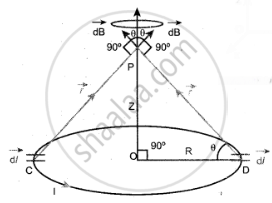 Consider a current carrying circular loop of radius R and let I be the current flowing through the wire in the direction. The magnetic field at a point P on the axis of the circular coil at a distance z from its center of the coil O. It is computed by taking two diametrically opposite line elements of the coil each of length `vec"dl"` at C and D. Let `vec"r"` be the vector joining the current element `(1vec"dl")` at C to the point P.