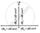 The magnitude of the magnetic field due to current element l dl at C and D are equal because of equal distance from the coil. The magnetic field dB due to each current element I `vec"dl"` is resolved into two components; dB sin θ along y-direction and dB cos θ along z-direction. Horizontal components of each current element cancel out while the vertical components (dB cos θ k^) alone contribute to a total magnetic field at the point P.