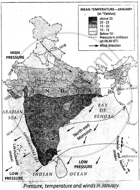 On an outline map of India, show the path of the northeast monsoons with arrows.