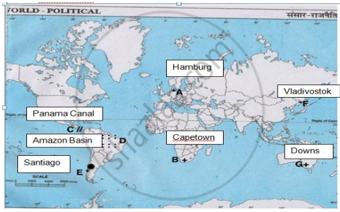 On the given political map of the world, seven geographical features have been marked as A, B, C, D, E, F, and G. Identify any five with the help of the following information and write their correct names.
