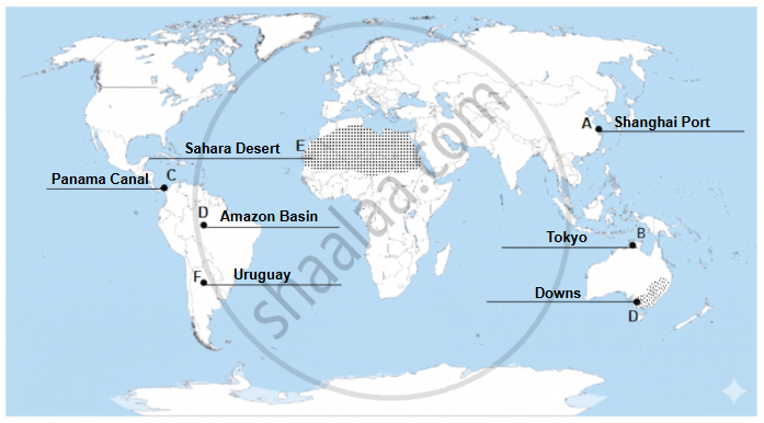 On the given political outline map of the world, seven geographical features have been marked as A, B, C, D, E, F and G. Identify any five with the help of the following information and write their correct names on the lines drawn near them: