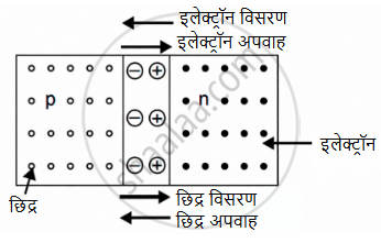 विसरण: एक n-प्रकार के अर्धचालक में, इलेक्ट्रॉनों की सांद्रता छिद्रों की तुलना में बहुत अधिक होती है, जबकि p-प्रकार के अर्धचालक में, छिद्रों की सांद्रता इलेक्ट्रॉनों की तुलना में बहुत अधिक होती है। जब p-n संधि बनता है, तो सांद्रता में इस अंतर के कारण छिद्र p-क्षेत्र से n-क्षेत्र की ओर (p → n) और इलेक्ट्रॉन n-क्षेत्र से p-क्षेत्र की ओर (n → p) गति करने लगते हैं। संधि के आर-पार आवेश वाहकों की इस गति के परिणामस्वरूप ‘विसरण धारा’ उत्पन्न होती है।