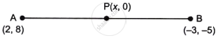 Point P(x, 0) divides the line segment joining the points (2, 8) and (–3, –5) in a certain ratio. Find the ratio and hence find the value of x.