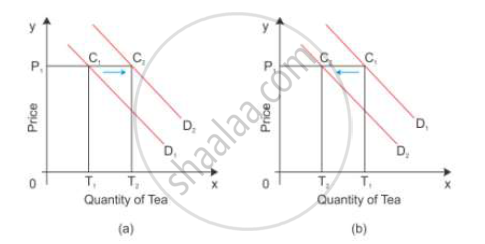 When the price of tea is OP1, the quantity demanded is OT1 as shown in diagram (a). If there is an increase in the price of the substitute good coffee, then the demand curve for tea shifts to the right. Now, the consumer is willing to buy P1C2 quantity of tea which is equal to OT2. Greater the purchase of a commodity at its constant price points to a situation of increase or forward shift in the demand curve. The consumer demand curve shifts from D1 to D2, consuming more of tea even when its price is constant.