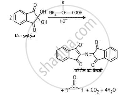 अमीनो एसिड के लिए निनहाइड्रिन परीक्षण: निनहाइड्रिन (2,2 डायहाइड्रॉक्सी इंडेन-एल, 3-डायोन) एक रसायन है जिसका उपयोग अमोनिया या प्राथमिक और माध्यमिक एमाइन का पता लगाने के लिए किया जाता है। इन मुक्त ऐमीनों के साथ प्रतिक्रिया करने पर, एक गहरा नीला या बैंगनी रंग विकसित होता है जिसे रुहेमैन बैंगनी के रूप में जाना जाता है। प्रोटीन का अमीनो एसिड विश्लेषण भी निनहाइड्रिन द्वारा किया जाता है। प्रोलाइन (एक द्वितीयक एमाइन) को छोड़कर, अधिकांश अमीनो एसिड (ए-एमिनो एसिड सहित) हाइड्रोलाइज्ड होते हैं और निनहाइड्रिन के साथ प्रतिक्रिया करते हैं। एक मुक्त अमीनो समूह और एक मुक्त कार्बोक्जिलिक एसिड समूह युक्त अमीनो एसिड निनहाइड्रिन के साथ मिलकर रंगीन उत्पाद का उत्पादन करता है। जब अमीनो समूह द्वितीयक होता है, तो संघनन उत्पाद पीला होता है।