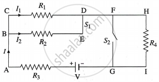 प्रतिरोध R1, R2, R3 और R4 आकृति में दिखाए अनुसार संयोजित किए गए हैं। S1 और S2 द्वारा दो कुँजियाँ दर्शाई गई हैं तो नीचे दिए गए बिंदुओं (मुद्दों) के आधार पर प्रतिरोधकों में से प्रवाहित होने वाली विद्युत धारा के बारे में चर्चा कीजिए।