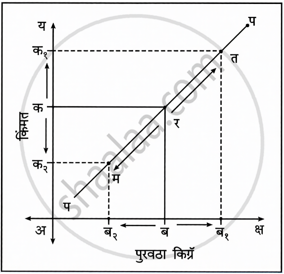 - वरील आकृतीवरून असे दिसून येते की, वस्तूची किंमत ‘अक’ पासून ‘अक१’ पर्यंत वाढल्यास वस्तूचा पुरवठा ‘अब’ पासून ‘अब१’ पर्यंत जास्त होतो. त्याचप्रमाणे, वस्तूची किंमत ‘अक’ पासून ‘अक२’ पर्यंत कमी झाल्यास वस्तूचा पुरवठा ‘अब’ पासून ‘अब,’ पर्यंत कमी होतो. म्हणजेच ‘पप’ हा पुरवठा वक्र वस्तूची किंमत व वस्तूचा पुरवठा यांमधील सम संबंध दर्शवतो. म्हणून पुरवठा वक्र डावीकडून उजवीकडे वर जाणारा असतो.