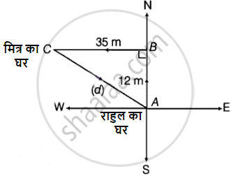राहुल अपने घर से उत्तर की ओर 12 m चलता है और फिर मुड़कर पश्चिम की ओर 35 m चलता है, ताकि वह अपने मित्र के घर पहुँच जाये। लौटते समय वह अपने मित्र के घर से अपने घर तक विकर्णतः चल कर पहुँचता है। लौटते समय उसने कितनी दूरी तय की?