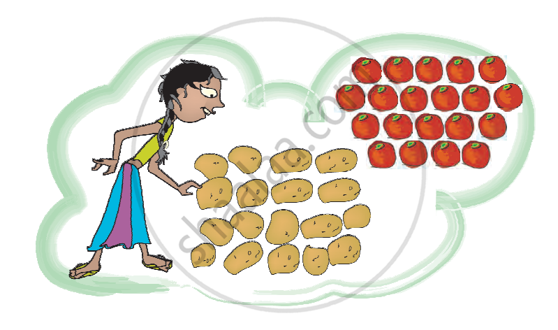 तो, हम अबूबकर के हिस्से को दिखाने के लिए 4 टमाटर और 6 आलू को नीले रंग में घेरेंगे। सृजा को टमाटर का `2/5` हिस्सा और आलू का `3/6` हिस्सा मिला।