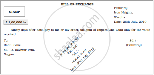 Rahul Sane, 86-D, Raviwar Peth, Nagpur accepted the bill drawn on him by Prithviraj, Icon Heights, Wardha for ₹ 87,000 on 30th July 2019. The bill was drawn on 26th July 2019 for ₹ 1,00,000 for 90 days after date.