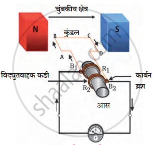 कुंडलाची दोन टोके R1 व R2 या दोन विद्युतवाहक कड्यांना B1 व B2 या कार्बन ब्रशांमार्फत जोडलेली असतात. ही कडी आसाला (अक्षाला) धरून बसलेली असतात, पण कडी व आस यांमध्ये विद्युतरोधी आवरण असते. B1 व B2 यांची टोके गॅल्व्हॅनोमीटरला जोडलेली असतात. गॅल्व्हॅनोमीटर (G) परिपथातील विद्युतधारेची दिशा दाखवतो.
