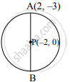 रेख AB हा वर्तुळाचा व्यास असून बिंदू P हे केंद्र आहे. A(2, -3)आणि P (-2, 0) असल्यास B बिंदूचे निर्देशक काढा.