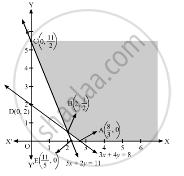 The coordinates of the corner points of the feasible region are A \[\left( \frac{8}{3}, 0 \right)\] , B \[\left( 2, \frac{1}{2} \right)\] and C \[\left( 0, \frac{11}{2} \right)\]