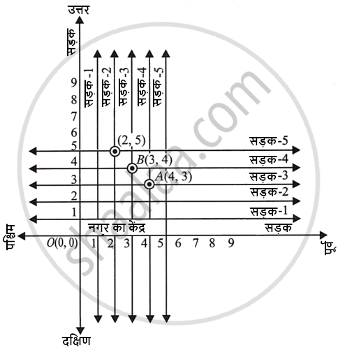 आपके मॉडल में एक-दूसरे को काटती हुई अनेक क्रॉस-स्ट्रीट (चौराहे) हो सकती हैं। एक विशेष क्रॉस-स्ट्रीट दो सड़कों से बनी है, जिनमें से एक उत्तर-दक्षिण दिशा में जाती है और दूसरी पूर्व-पश्चिम की दिशा में। प्रत्येक क्रॉस-स्ट्रीट का निर्देशन इस प्रकार किया जाता है: यदि दूसरी सड़क उत्तर-दक्षिण दिशा में जाती है और पाँचवीं सड़क पूर्व-पश्चिम दिशा में जाती है और ये एक क्रॉसिंग पर मिलती हैं, तब इसे हम क्रॉस-स्ट्रीट (2, 5) कहेंगे। इसी परंपरा से यह ज्ञात कीजिए कि
