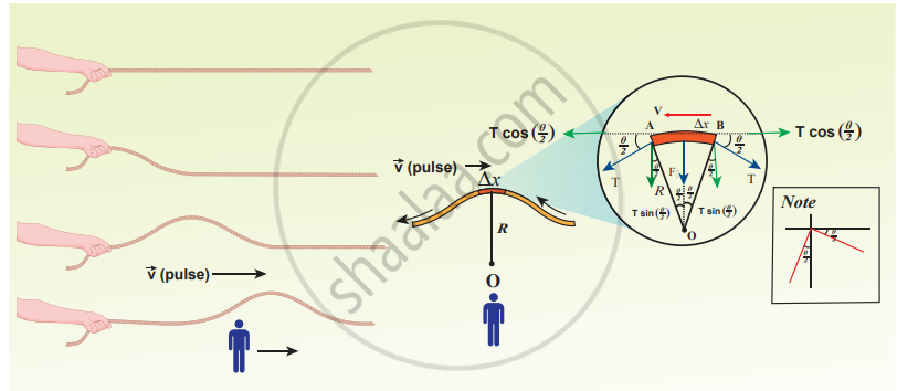 Consider an elemental string AB having a curvature which looks like an arc of a circle with centre at O, radius R and the arc subtending an angle θ at the origin O as shown in Figure. The angle 0 can be written in terms of arc length and radius as `"dl"/"R"` = θ. The centripetal acceleration supplied by the tension in the string is