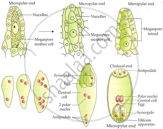 Show the development of megaspore mother cell upto the formation of mature embryo sac in flowering plants with the help of labelled diagrams only.