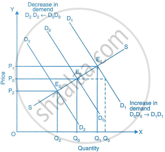 When there is an increase in demand, the demand curve shifts rightward from D0D0 to D1D1. At the same price OP0, the new quantity demanded rises to OQ3, but the quantity supplied stays at OQ0. This causes an excess demand equal to Q0Q3. As a result, the shortage pushes the price upward, moving the market toward a new equilibrium.