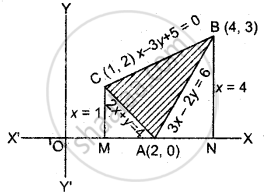समाकलन विधि का उपयोग करते हुए, रेखाओं 2x + y = 4, 3x – 2y = 6 एवं x – 3y + 5 = 0 से घिरे क्षेत्र का क्षेत्रफल ज्ञात कीजिए।