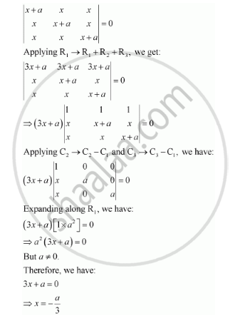 Solve the equations `|(x+a,x,x),(a,x+a,x),(x,x,x+a)| = 0, a != 0`
