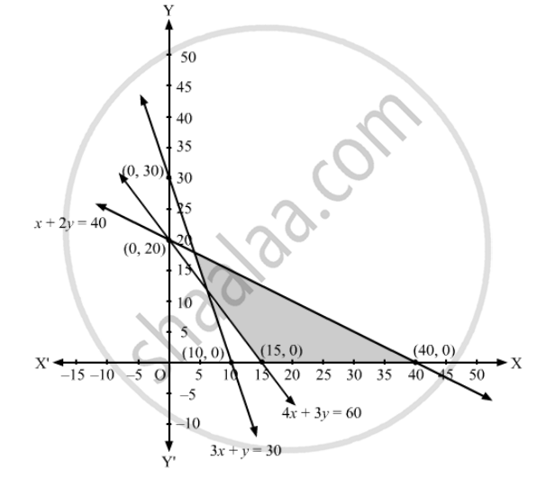 x + 2y ≤ 40, 3x + y ≥ 30, 4x + 3y ≥ 60, x ≥ 0, y ≥ 0