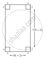 Now, length, breadth and the height of the rectangular box are 15k – 2x, 8k – 2x and x respectively.