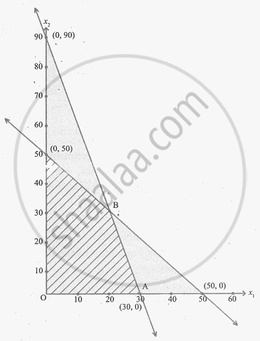 The feasible region is OABC and its co-ordinates are O(0, 0) A(30, 0) C(0, 50) and B is the point of intersection of the lines