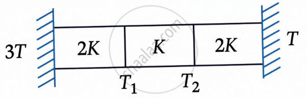Three identical heat conducting rods are connected in series as shown in the figure. The rods on the sides have thermal conductivity 2K while that in the middle has thermal conductivity K. The left end of the combination is maintained at temperature 3T and the right end the at T. The rods are thermally insulated from outside. In steady state, temperature at the left junction is T1 and that the right junction is T2. The ratio T1/2 T is: