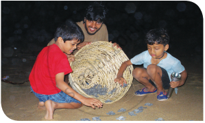 Volunteers of the Students Sea Turtle Conservation Network (SSTCN) release Olive Ridley hatchlings into the sea. |