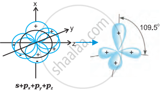 (iii) sp3 संकर कक्षक (sp3-hybridised orbitals) - sp3 संकरण में परमाणु की संयोजकता कोश के s-उपकोश का एक कक्षक तथा p-उपकोश के तीन कक्षक संयोजित होकर समान आकृति एवं तुल्य ऊर्जा के चार sp3 संकर कक्षक बनाते हैं। ये चारों sp3 संकर कक्षक एक चतुष्फलक के चारों कोनों पर निर्देशित रहते हैं।