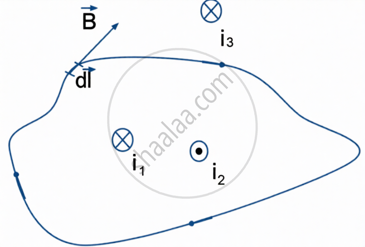 Ampere’s circuital law states that the line integral of magnetic field induction `vecB` around a closed path in vacuum is equal to μ0 times the total current I passing through the surface, i.e. `ointvecB.vec(dl)=mu_0I`