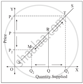 - From the diagram it can be seen that as price rises from OP to OP1 supply rises from OQ to OQ1. Similarly, as price falls from OP to OP2 supply falls from OQ to OQ2. Supply curve, i.e., SS indicates the direct relationship between the price and the quantity supplied of a commodity
