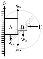 The normal reaction force on the system (comprising of wall and contact surface of Aand B) is provided by F. As can be seen from the figure, the weight of A and B is in the downward direction. Therefore, the frictional force fA and fBA (friction on B due to A) is in upward direction.