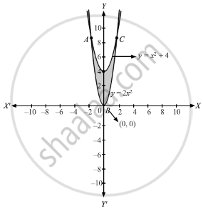 \[A = \int_{- 2}^2 \left( y_1 - y_2 \right) d x ...........\left(\text{Where }, y_1 = x^2 + 4\text{ and }y_2 = 2 x^2 \right)\]
