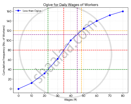 ii. Upper quartile wage (Q3): The upper quartile is the `((3N)/4)^(th)` term, which is the 120th observation. From the Ogive, at CF = 120, the corresponding wage is approximately ₹ 48.33.