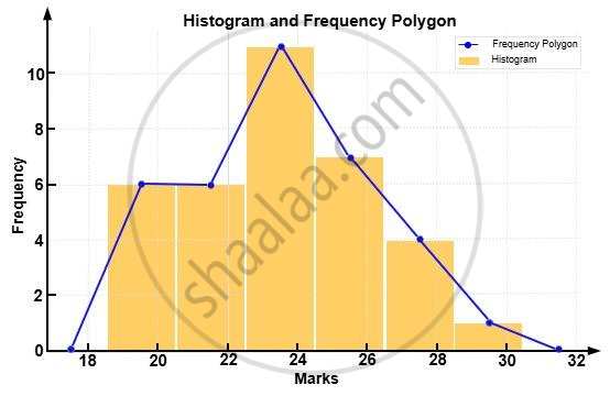 Here is the combined histogram and frequency polygon for the data given. It shows the distribution of marks in class intervals like 19 – 20, 21 – 22, etc., for 35 students. The bars represent the frequency per interval and the blue line traces the frequency polygon through class midpoints.