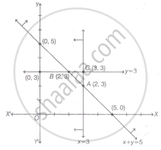 Here, intersecting point of lines x = 3 and x + y = 5 is A(3, 2), intersecting point of lines y = 3 and x + y = 5 is B (2, 3} and intersecting point of lines, x = 3 and y = 3 is C(3, 3).