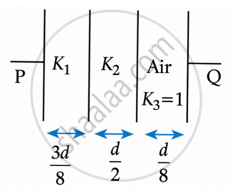 The plates of a parallel plate capacitor are separated by d. Two slabs of different dielectric constant K1 and K2 with thickness `3/8 d and d/2`, respectively, are inserted in the capacitor. Due to this, the capacitance becomes two times larger than when there is nothing between the plates. If K1 = 1.25 K, the value of K1 is: