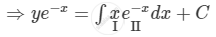 \[ \Rightarrow y e^{- x} = x\int e^{- x} dx - \int\left[ \frac{d}{dx}\left( x \right)\int e^{- x} dx \right]dx + C\]