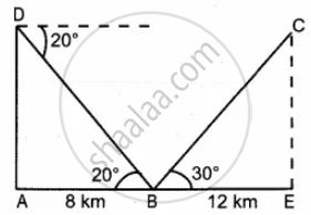 Three villagers A, B and C can see each other using telescope across a valley. The horizontal distance between A and B is 8 km and the horizontal distance between B and C is 12 km. The angle of depression of B from A is 20° and the angle of elevation of C from B is 30°. Calculate the vertical height between B and C. (tan 20° = 0.3640, `sqrt3` = 1.732)
