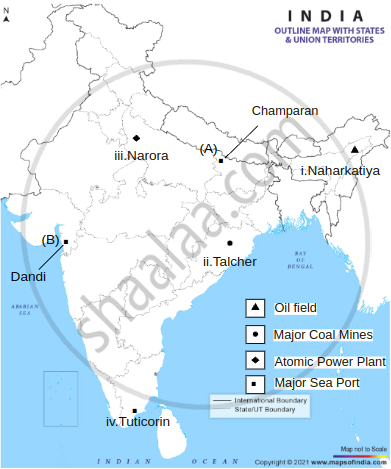 (a) Two places, 'A' and 'B', have been marked on the given political outline map of India. Identify them with the help of the following information and write their correct names on the lines drawn near them: