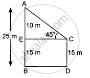 Two poles are 25 m and 15 m high and the line joining their tops makes an angle of 45° with the horizontal. The distance between these poles is 10 m.