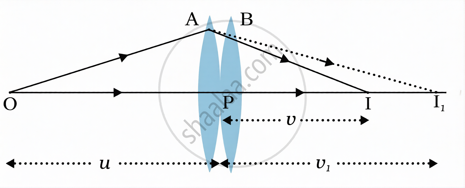 `1/v_1 - 1/u = 1/f_1` ...(1)