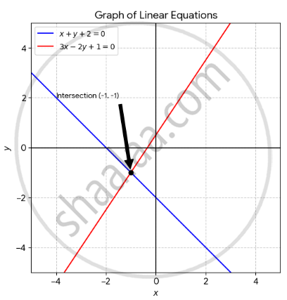 Use graph paper and take 2 cm = 1 unit on both axes. Draw the graphs of x + y + 2 = 0 and 3x – 2y + 1 = 0. Write down the co-ordinates of the point of intersection of the lines.